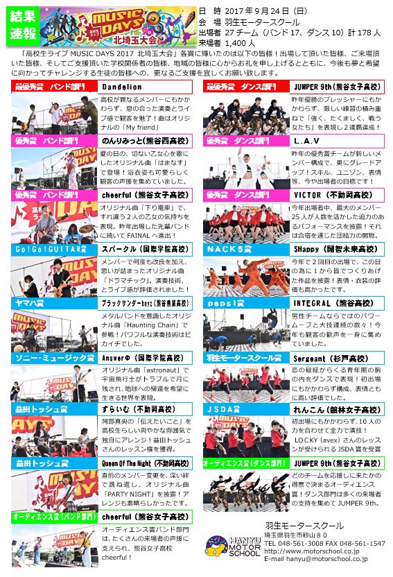 9月24日(日)、羽生モータースクールにおいて「高校生ライブ MUSIC DAYS 2017 北埼玉大会」が開催されました♪出場したのはバンド17、ダンス10の合わせて計27チーム、総勢178名の皆様!!当日ご参加頂いた来場者と合わせて約1,400名の下での大会となりました(^_-)-☆