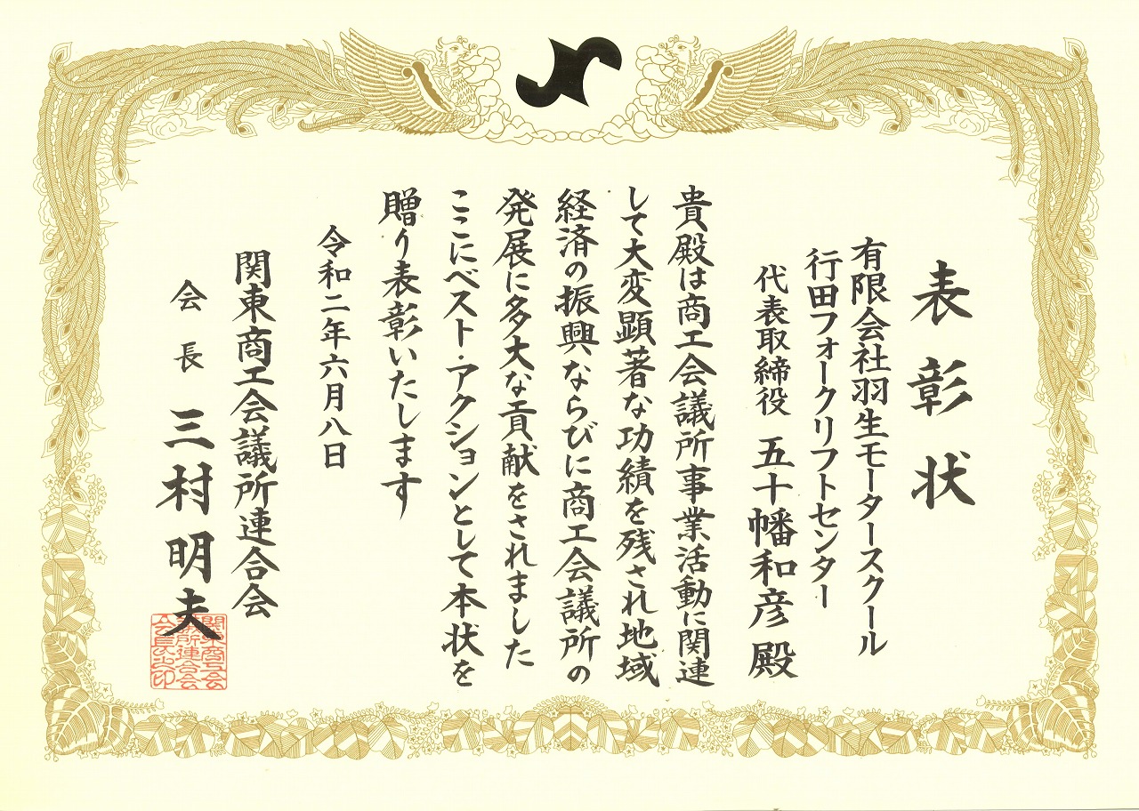 14日(火)行田商工会議所常任議員総会が行われ、羽生モータースクール/行田フォークリフトセンターが関東商工会議所連合会会長三島明夫様より、